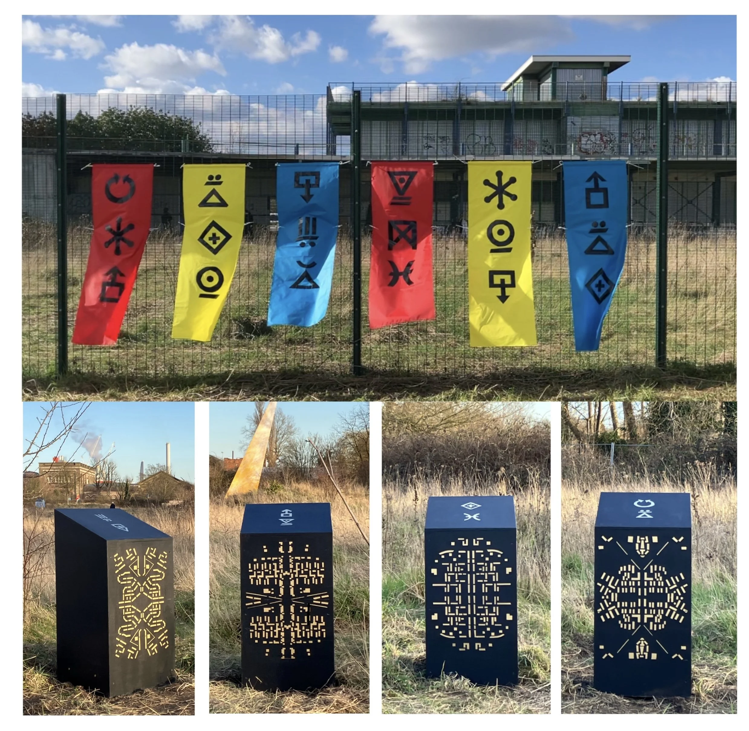Having to improvise, learn new techniques, keep reinventing - slows me down, gives me time to reflect, engage with the issue. Finding a unique format encourages me to find other connections, add another connotation. Formats have included my version of a monument, a shrine, signal flags, a guard of ‘guardians’, as well as banners inspired by trade unions or traditional rug designs - reinventing and improvising again being key. Adapting for public spaces always requires more problem solving. Sites have included a disused golf centre in Thamesmead, an old orchard, an avenue of trees, city billboards and city walls, an arch under a London Bridge.