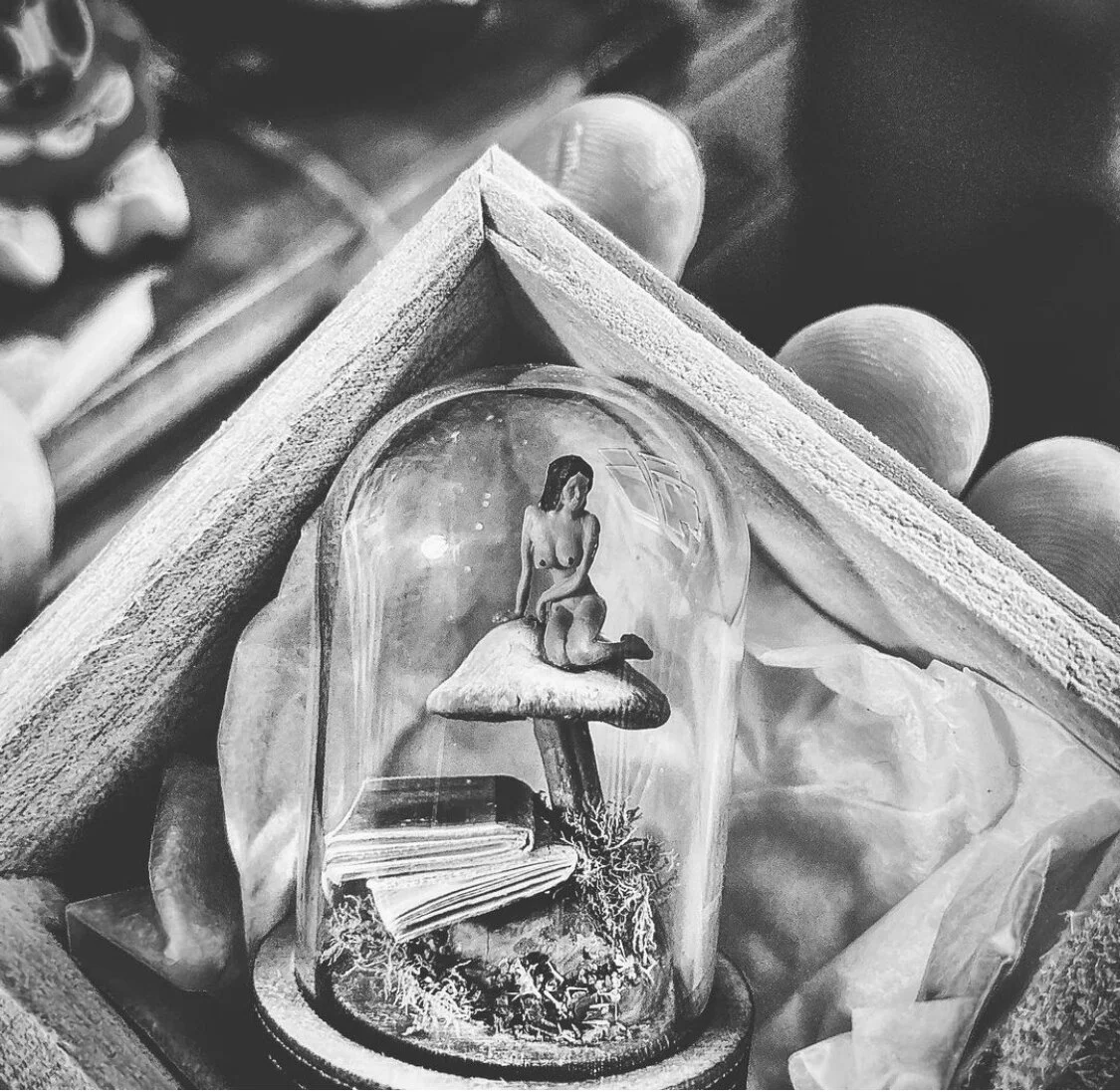 My practice moved from a busy start in Children's book illustration, which I did when I first left University in 92, to more advertising and editorial work. Then when I first moved to Margate 10 years ago I began to do a lot more experimental and 2D work and now my practice has moved on to more 3D miniature escapism (for the time being!) where I am very busy with Instagram sales as well as private commissioned work. Using the small figures, I create a mainly humorous, sometimes a little dark environment, a moment in time or a place that we can dream through. I love collecting flora and fauna and using nature's own materials and things that people would normally throw away within my work, be it a pair of wings from a dead fly on the windowsill, a poppy seed head or just a delicate butterfly and some old moss. With these and create tiny mystical people, coupled with tiny speech bubbles cut from old comics and obscenities from ancient Viz issues. My work is neither serious nor intellectual. It is just made to make you smile. a bit of lighthearted fun. But I may occasionally use the platform to say something more meaningful.