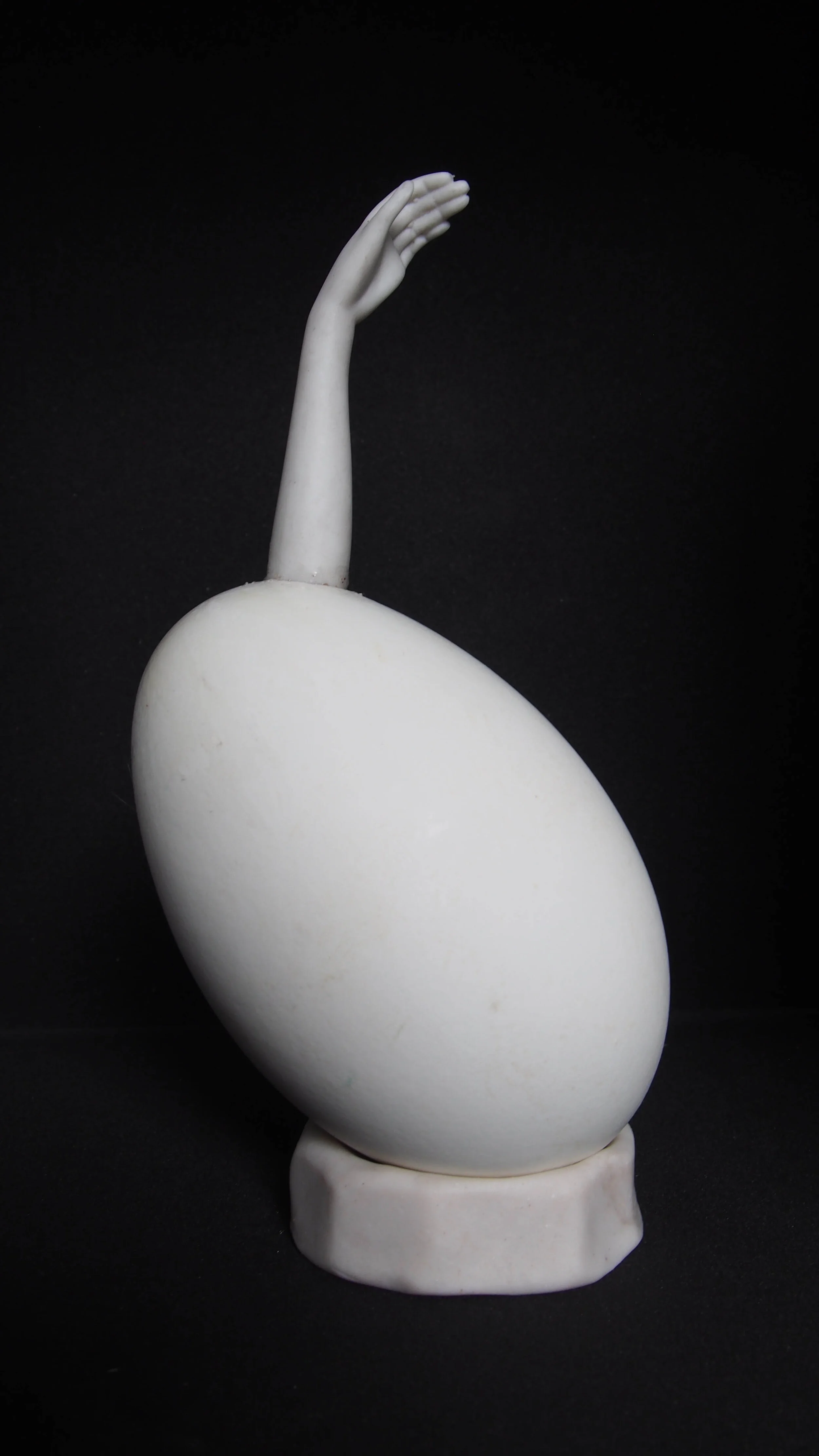 Description 'Reach,' 2021. Mixed-media sculpture, (goose egg, Porcelain, and polymer clay). A Metamorphosis, altering the reality through the uncanny, drawing attention to underlying resentments and turmoil’s through a nonsensical and appalling transformation of nature. In his essay The Uncanny (1919), Freud writes about how the uncanny is associated with the bringing to light of what was hidden and secret, distinguishing the uncanny from the simply fearful by defining it as "that class of the terrifying which leads us back to something long known to us, once very familiar." The unseen figure reaching out of the egg. Reaching out of Its familiar space into the unknown. A body transforming. The most difficult obstacle I had to overcome when making this piece was removing the yoke from the goose egg, and making a hole for the arm big enough without the shell cracking. this is actually the second egg I used, as the first cracked under the pressure..