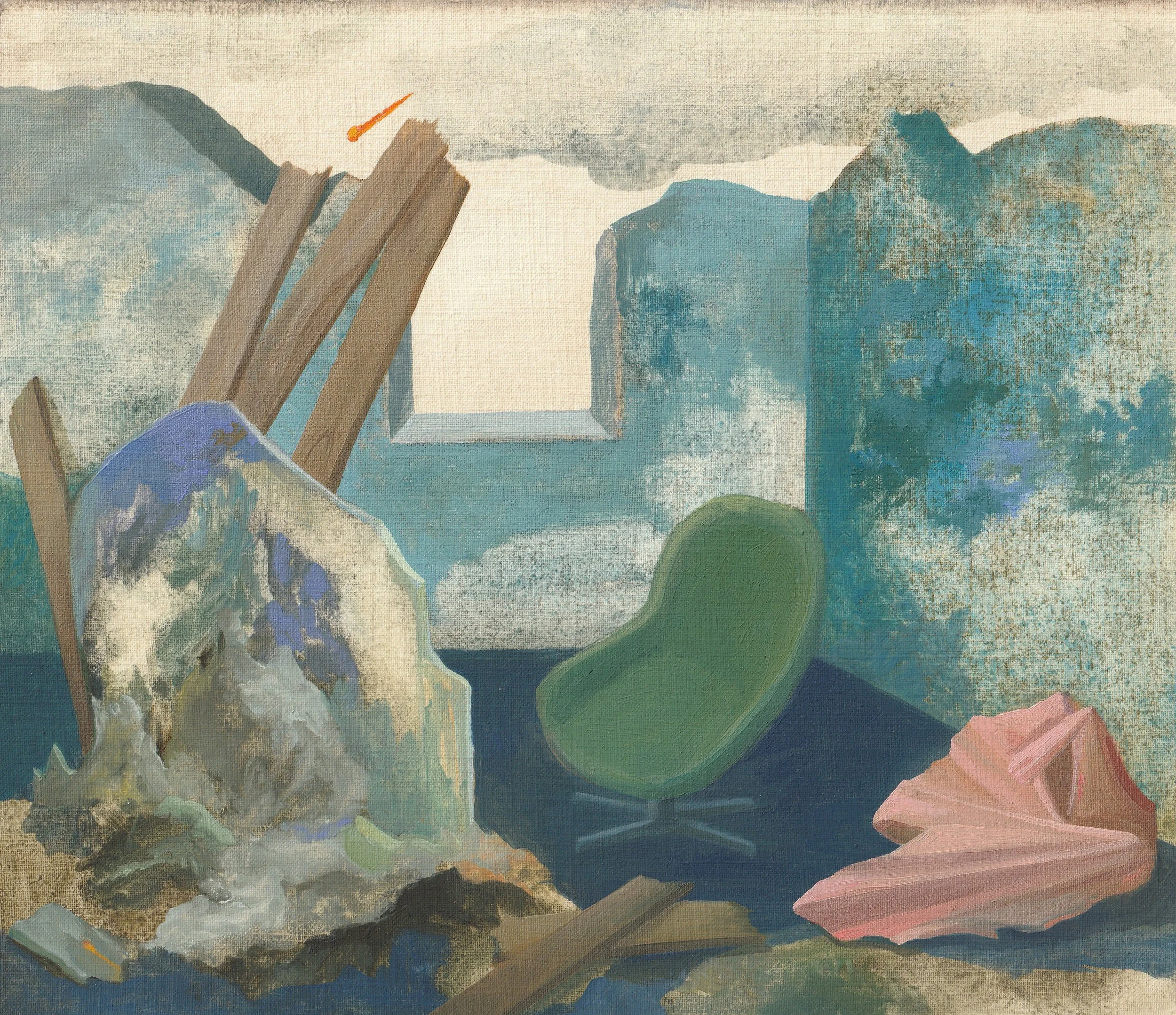 Description: I made this painting from memory and invention of a semi-collapsed building I saw while walking in the Southern Hebrides a few years ago. There wasn't much of the roof left but relatively new electrical goods and other household items were scattered around the floor. There was no sign of a fire or anything that had obviously caused the disaster. I keep returning to this place in my mind and work, drawn in by the still tangible human presence and the unknown events that led to the house's ruination. It seems almost post-apocalyptic - prosaic but profound; familiar but not familiar; uncanny while also being very ordinary.