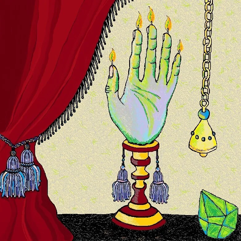 Description: In my mind there is a cabinet of curiosities containing all manner of oddities, including the Hand of Glory. I don't have a physical wunderkammer, but use illustration to add to my imagined room of wonder. Using the simplicity of MS Paint to remove the objects from my brain and make the items 'real' is something I get obsessed over.