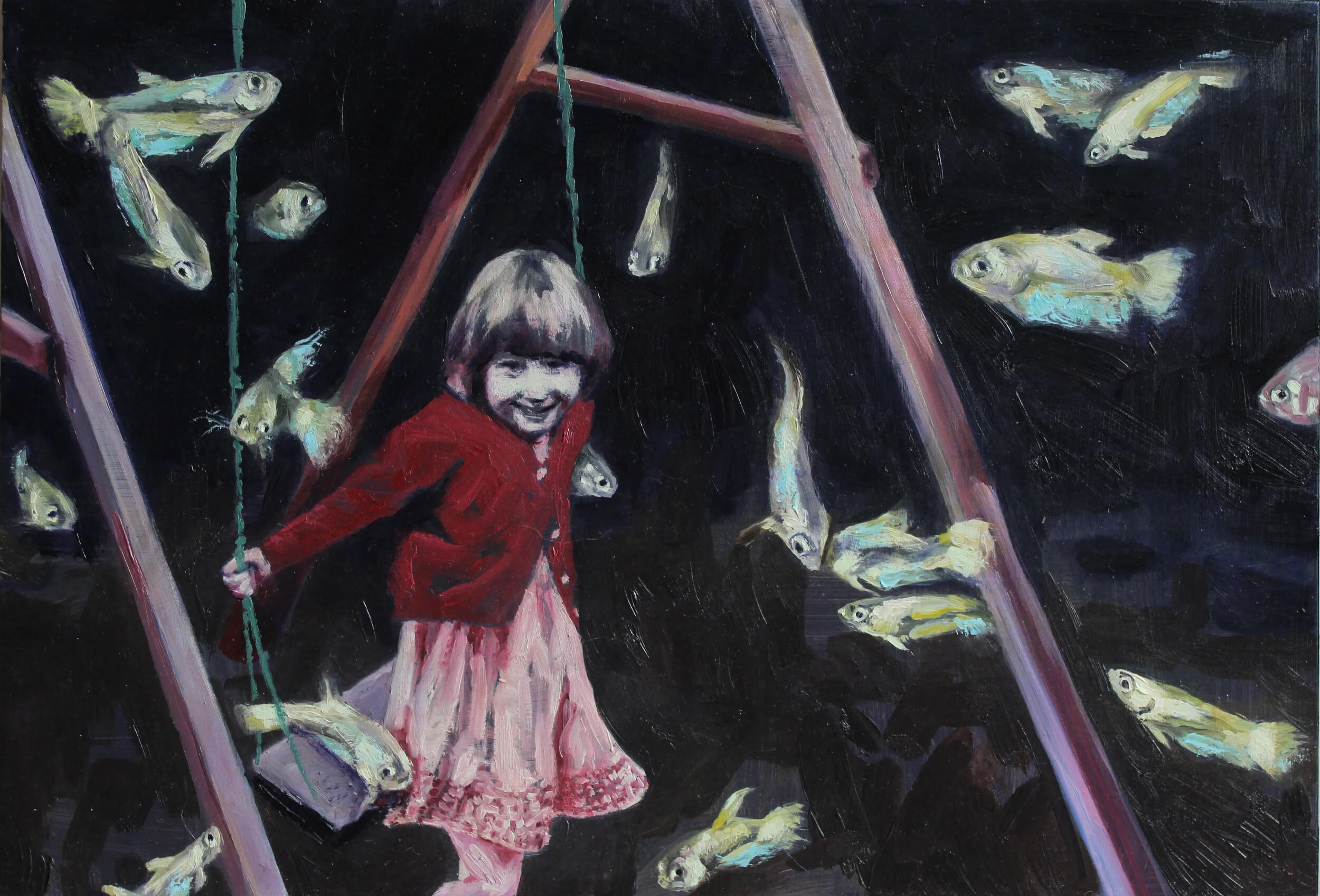 Description: This painting is a re-thinking of an old family photograph, looking back at it from the future, with the knowledge of the way time and events unfolded since it was taken. The work is one of a series of paintings in which thoughts have crept into images in the form of creatures or unexpected interruptions. In this way, the old photographs have become entirely reimagined and fictionalised. The notion of the uncanny is inherent in the work through unsettling and unreal scenes. They are open to interpretation from the viewer, but on a personal level they are, in part, a melancholy reflection of lives blighted by the development of Schizophrenia in a family member. They are painted on a small scale to demonstrate a glimpse of the private and personal that viewers see. It was difficult to create a sense of the uncanny in these paintings without making them seem overly menacing or threatening, which wasn't the intention. The aim was to create a sense of otherworldliness in the everyday, so that something uncomfortable emerges.