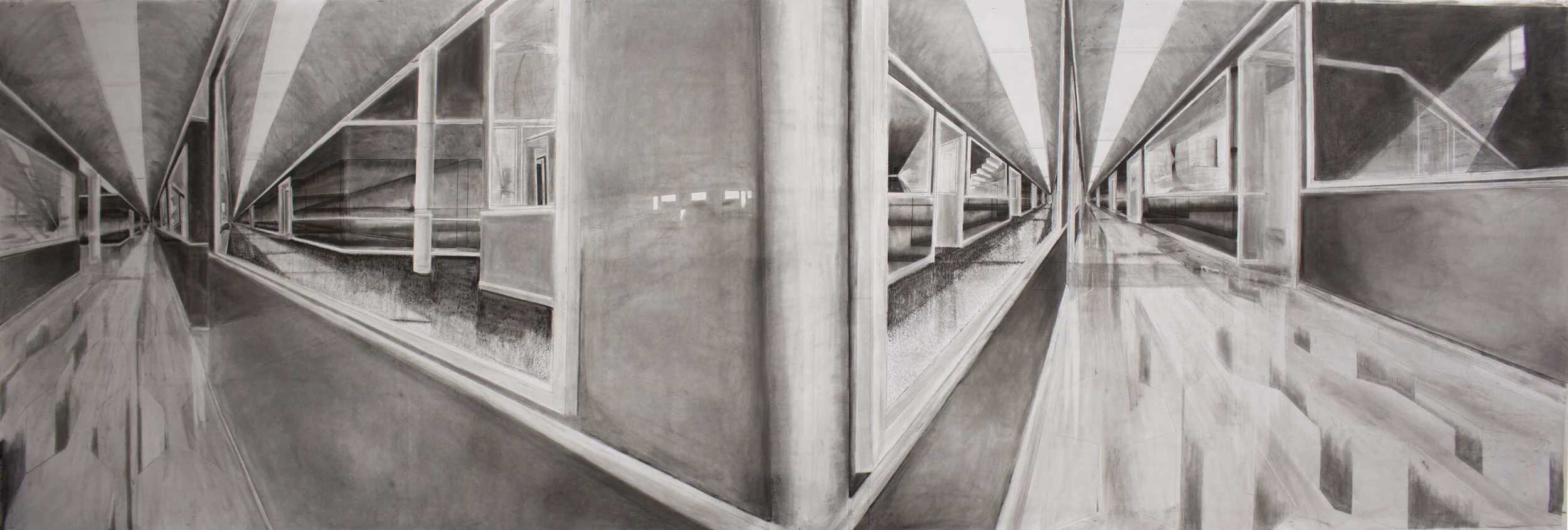 Description: Pacing through my memories and choices, I stopped short on the threshold of each tangent. Spurred on by The Weird and The Eerie to pursue the meeting of aesthetics within the uncanny, I created a drawing 4.7m in length to struggle with the enormity of the answer to where next in my life, as my past met my present. I frequently got lost in the scale, overwhelmed by the outcome.