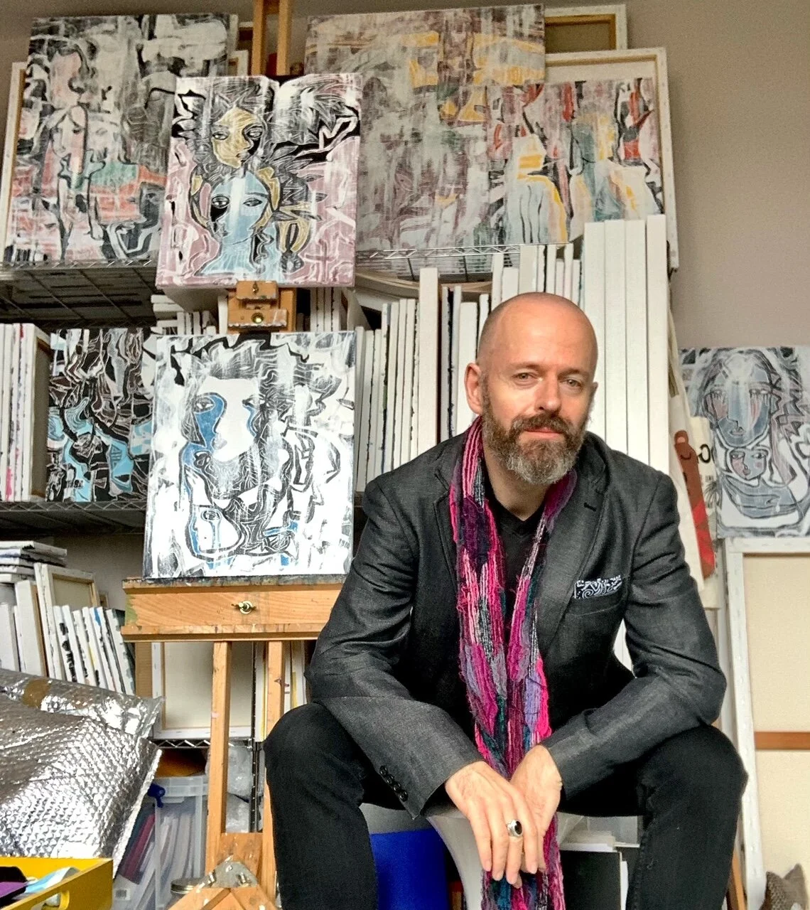 My art practice centers around intuitive drawing and painting. I rarely pre-plan. If I do then the original idea is still based on an intuitive artwork. Often starting points are abstract shapes and marks, other times doodles from a sketchbook with my left hand. My practice is meditative and spiritual. In trying to connect to a creative source, I often find the end result describes a specific place or people. A sanctuary. A tribe. Images are also connected with a childhood memory.