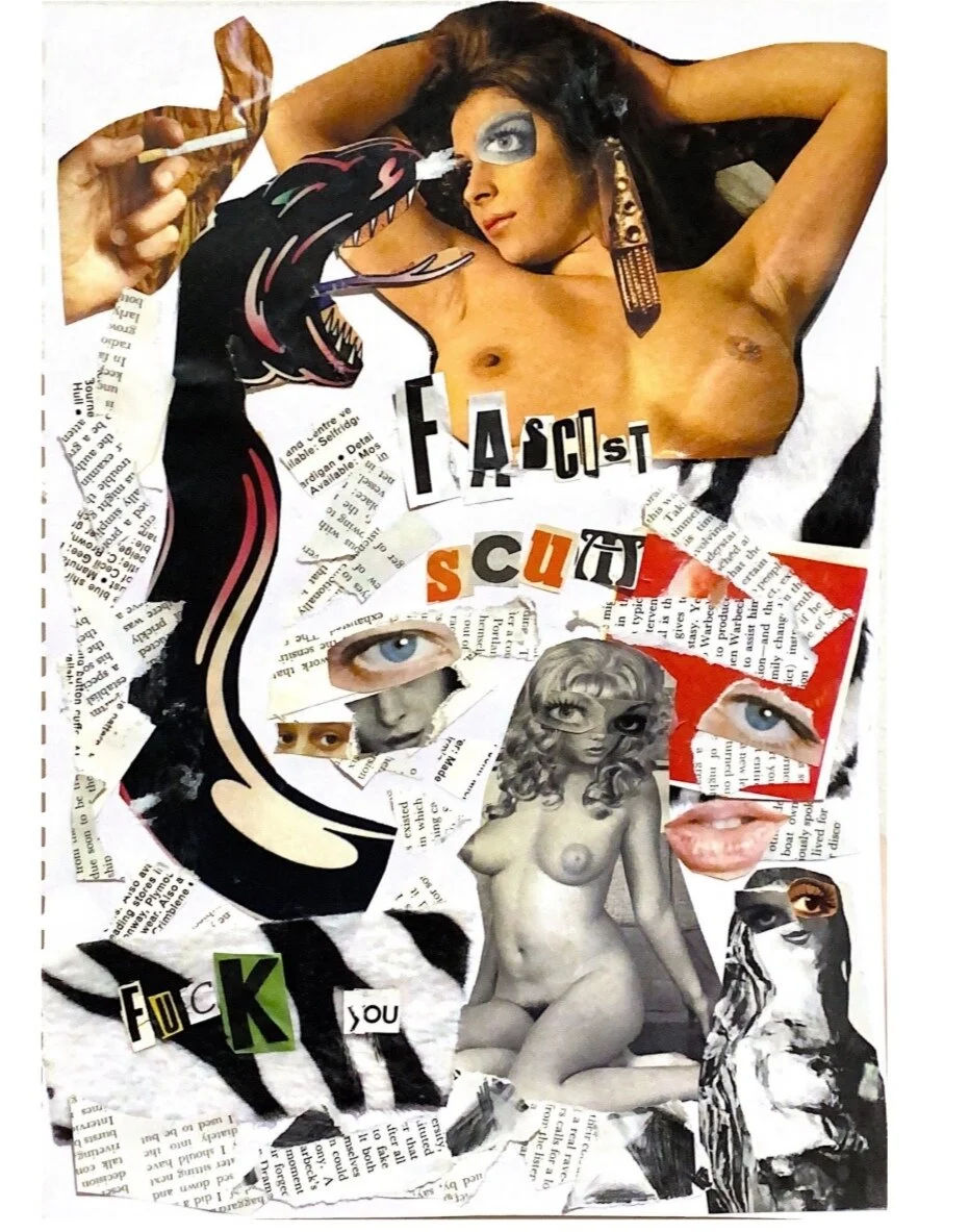 Gem she/her, as a self-confessed bimbo for social justice, I make slaggy socialist multimedia collages. My art subverts the male gaze and promotes positive sexuality using hyper femme images contrasted with blunt, socialist messages. I create art about my own identity as a bi femme working-class woman and use themes of wealth redistribution, class divide, queerness, and sexual autonomy in my art and writing.