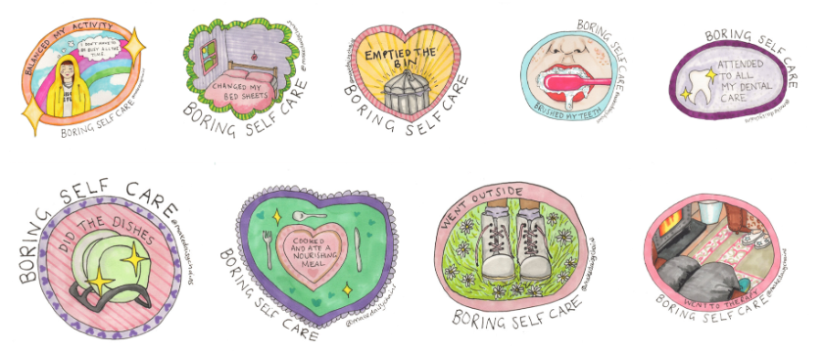 Various illustrations from Hannah Daisy, as part of the #BoringSelfCare project, 2017-2020