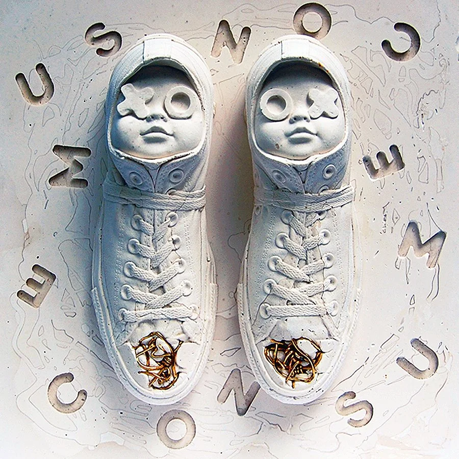 THE CONSUMER GAME [V.15-BLOCK] - The trainers contain the sculpted faces of two ‘babies’ with a nought over one eye and a cross over the other, emphasising the ‘game’. These ‘babies’ represent the everyman, all of us, swaddled and coerced by the corporate surround [the trainer hereby acting as an emblem for the all-encompassing nature of this world.