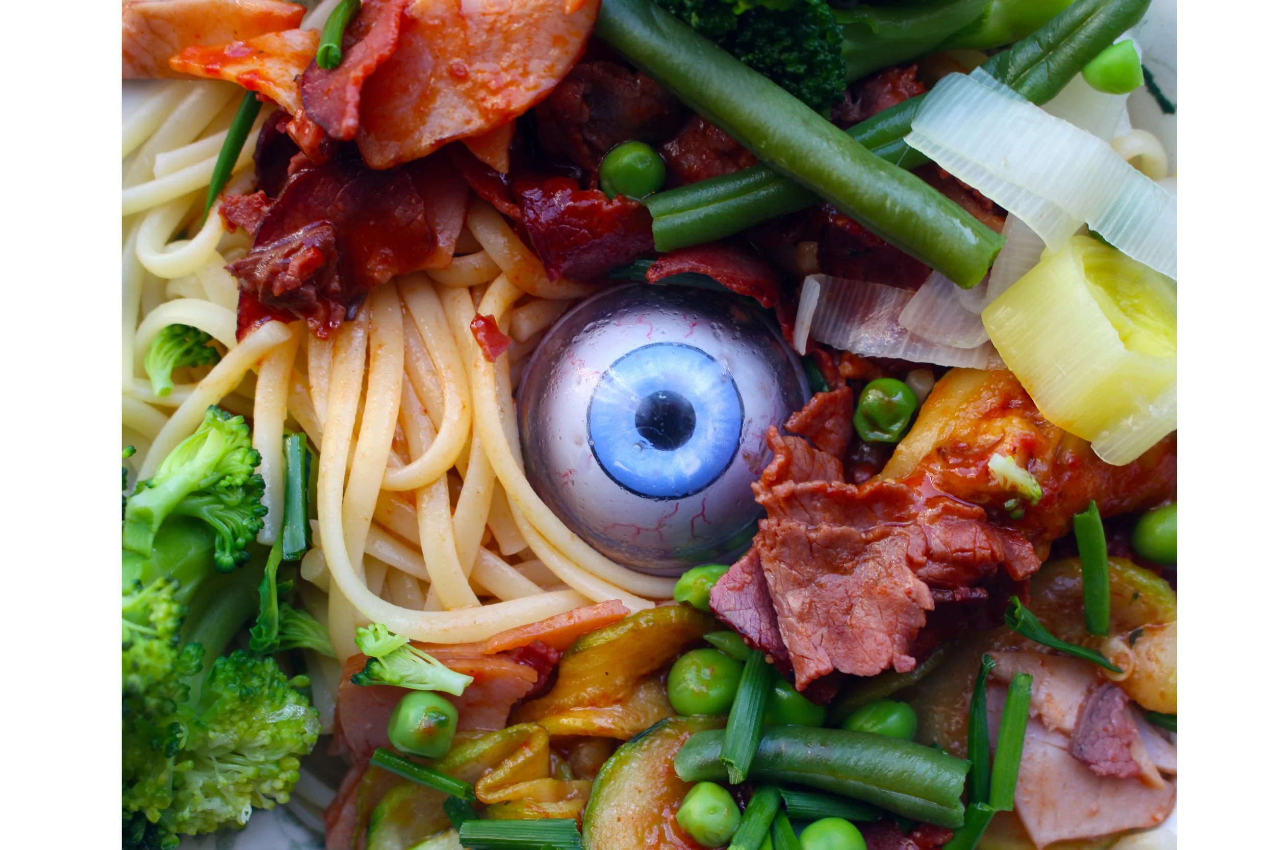 Description: I`m so sorry dear cow, pig, horse, chicken, game, …, salmon, cod, ..., worm, beetle, …., salad, carrot, potato, … , but I`m hungry.
