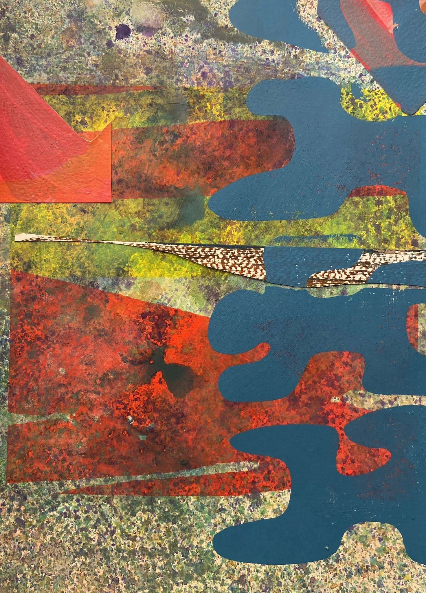 The artists live on opposite sides of the planet and had been constrained to virtual collaboration. An opportunity for in-person meeting occurred in 2022, where the ability to be hands-on with each other's physical work led to unexpected synergy of thought and motion. Over the space of two evenings, with the intensity of proximity, 4 collaborative works ensued, centred around the core idea of destruction and rebuilding, with several originals being physically disassembled and reconstructed anew using tape, glue and other salvaged materials. The trust in each other's process and a letting go of attachment to a finished idea all meant that, as well as the completed work, ideas generated within the collaboration could be taken away to inform future individual work.