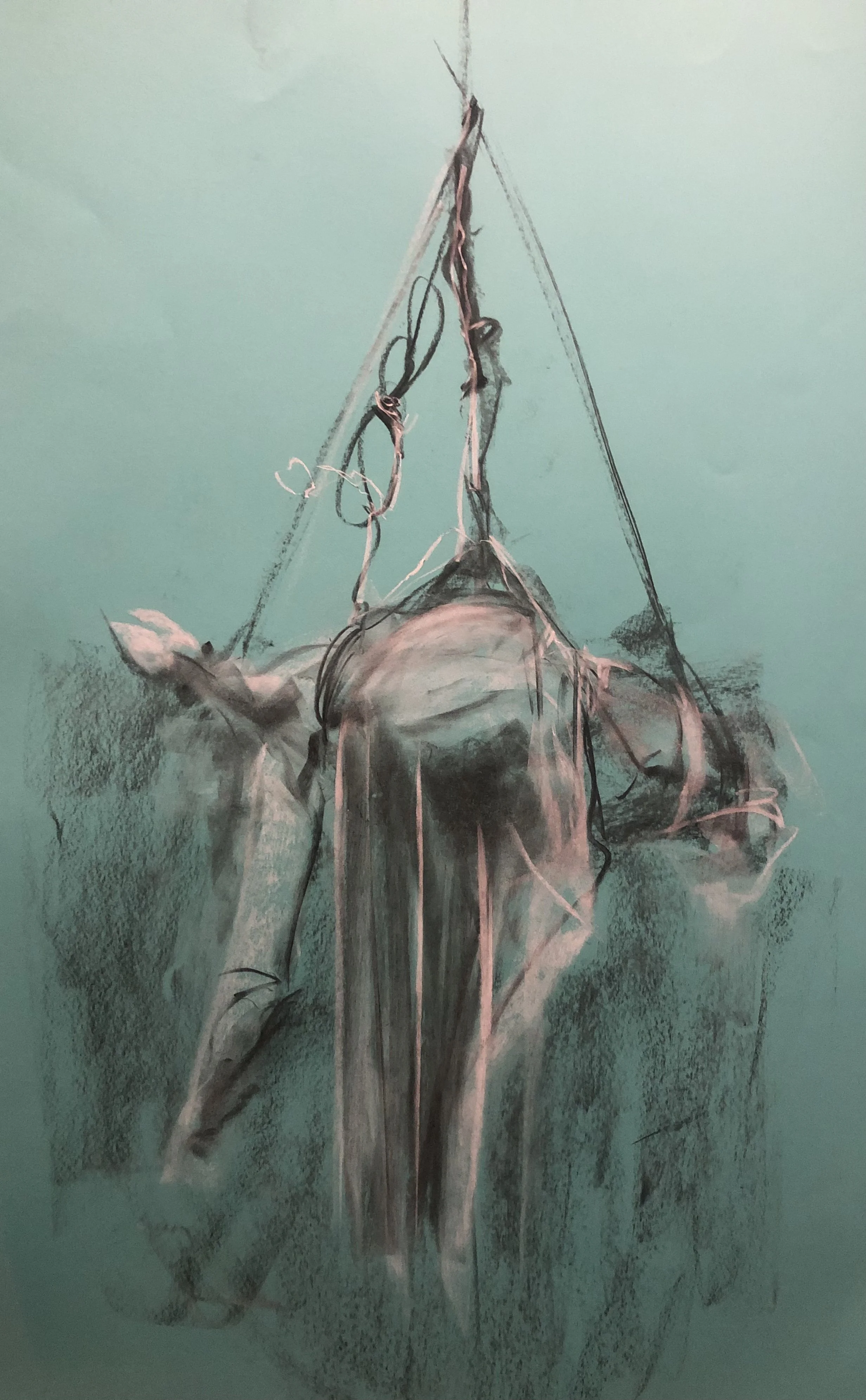 Description: A visual response to the Japanese art of tying with lines and ropes. The model was tied and suspended from a crypt ceiling.