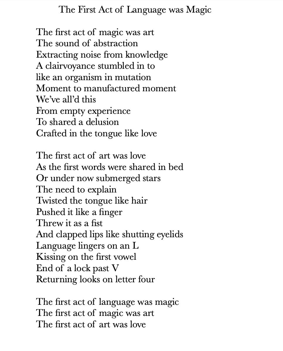 The First Act of Language was Magic is a poem that explores the moment sound was first used to try and communicate complex emotion. It imagines this act as magic. This conception of magic is a philosophical idea, where magic is a term used to connote the spontaneous abstraction of our concrete universe, or our emotional interior, into expression. This abstraction, this magic, is then an artistic utterance. The poem suggests the first attempt may have been to express love and that in succeeding sound became art.