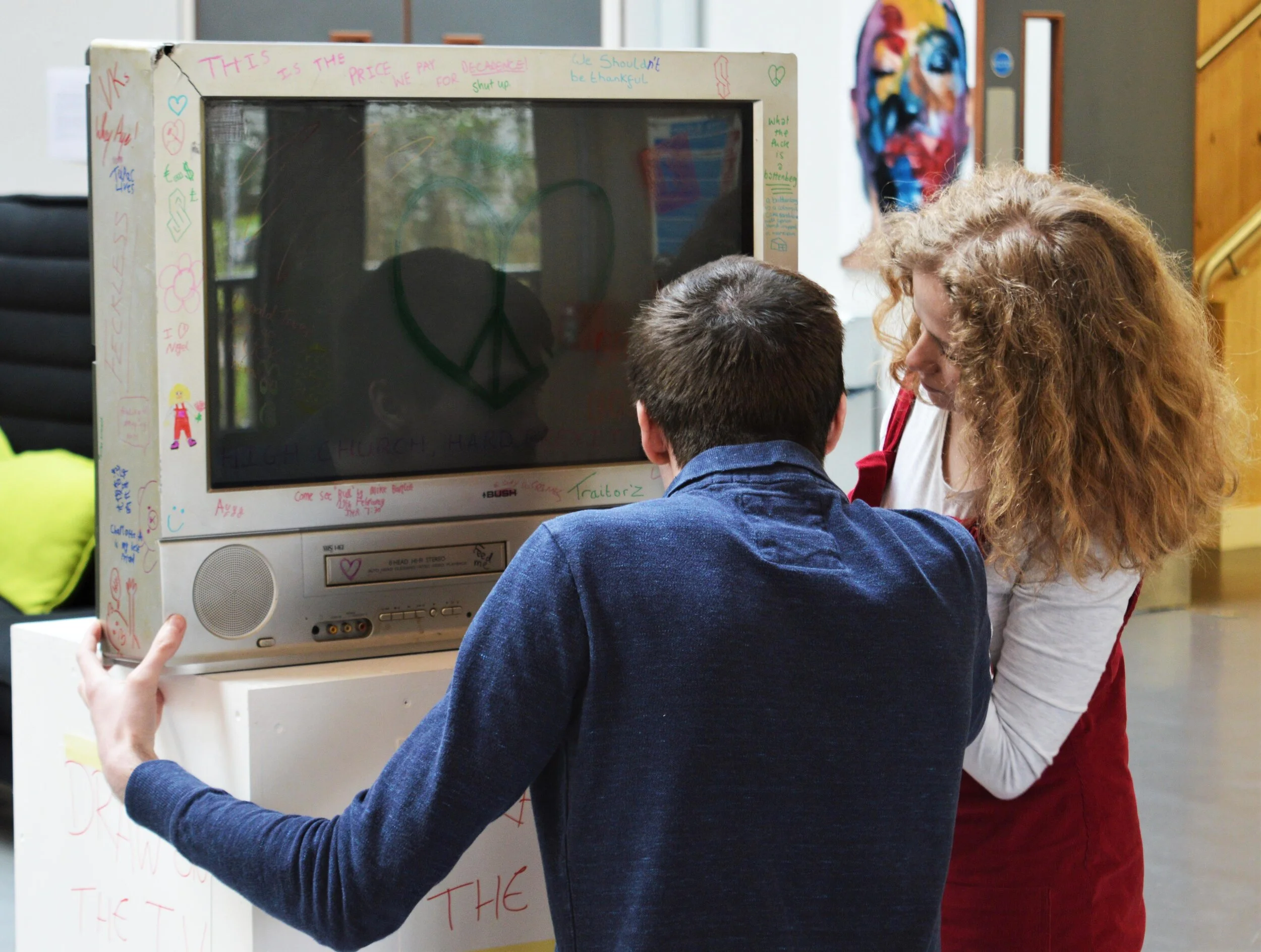 Description: Childhood and play are this work's main focus, contemplating how creativity is often inhibited from an early age. The installation of everyday, household objects invites the public to interact with them through the mediums of drawing and writing, in a manner that would typically be disciplined in childhood; set up in a public area, passers-by are able to form unspoken conversations between each other.