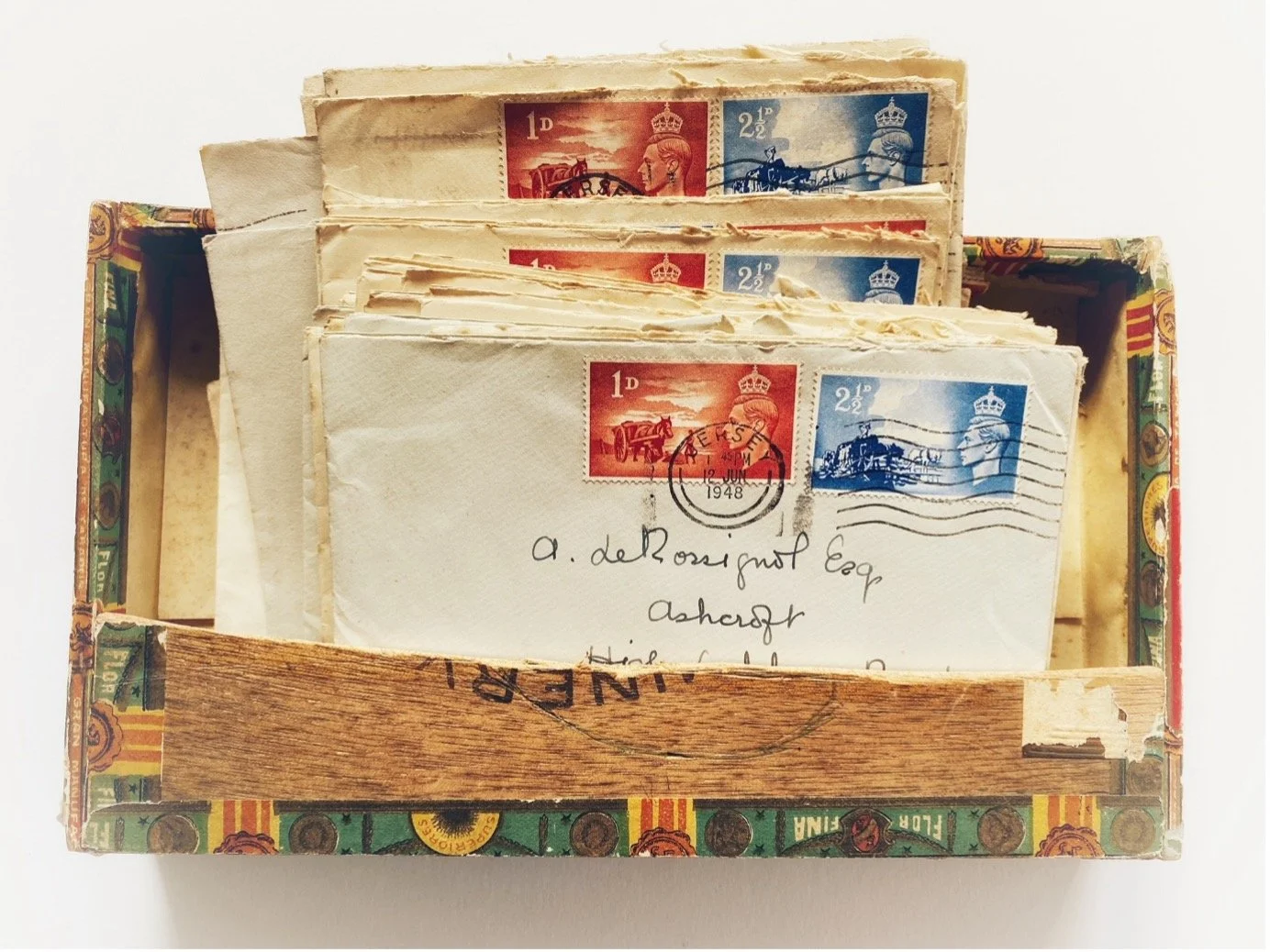 the pile of envelopes inside. Each envelope has been carefully opened with a paper knife, softening the edges with a tear. All except one, have been posted from the Channel Island of Jersey and thirty-three were sent to the same recipient, A Le Rossignol Esq. They are a gift from a mother to a son. The cursive writing flows along the envelope under the stamps featuring George V1, each letter connected to the next. All are post marked between May and July 1948, three years after the German occupation, almost a letter a day. I stare at the empty envelopes. Why weren’t the letters kept? I think of the writer. This is a conversation held in silence, only the empty husks of her thoughts remain. Was this a way of ordering her days: marking each day with a new page, the rhythm of filling the pen then sending the words across the paper. She seals the envelope and sticks on the stamps using a damp sponge as it wouldn’t seem right to lick the back of the King. I think of her walking to the post box with the letter in a gloved hand. She posts it carefully through the slot, listening as it falls to join others, then turns and heads home. She will wait for a reply, the deep hunger for knowledge of another’s life, her son does visit sometimes, crosses the short stretch of sea but she fears leaving the Island. She is contained by its beaches and headlands. I am faced by an empty space. What did she write, what news did she share? Can I find her voice, find stories to fill the empty envelopes. I search through family albums and keepsakes and gather fragments to piece together.
