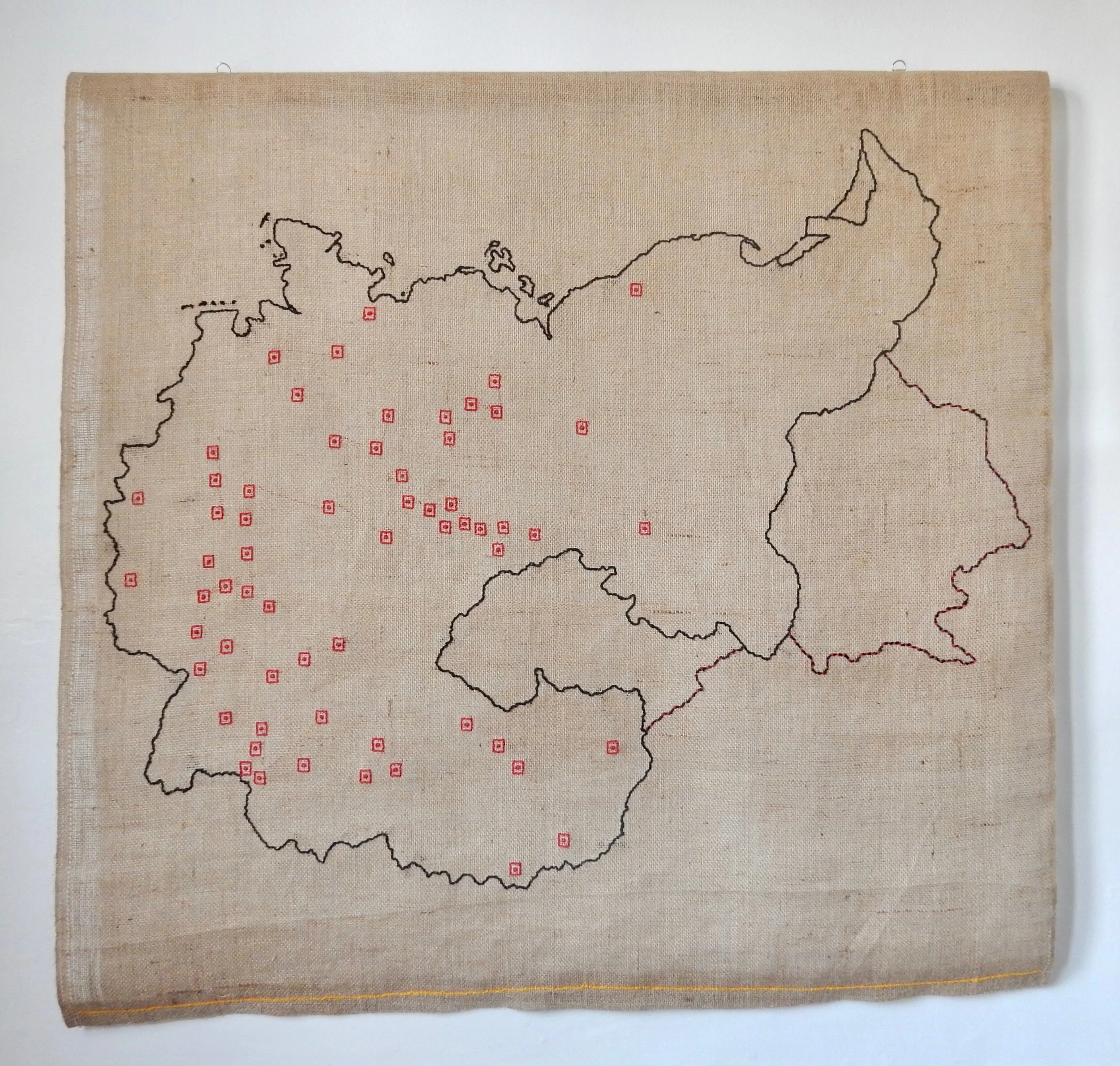 Here is a map embroidery of many of the centres used in this euthanasia. Each place is given equal status, irrespective of the number of people killed there or by what method. It is made on Hessian, the same material used in making sacks from. The sewn-in yellow line at the bottom represents the final colour of the German flag. The outline is the size of Germany’s regional borders in 1939.